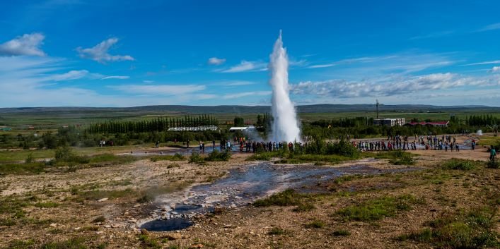 One of the greatest natural attractions of Iceland and part of the famous "Golden Circle Tour", The Great Geysir, or Stori-Geysir, has been dormant since 1916 when it suddenly ceased to spout. It came to life only once in 1935, and as quickly went back to sleep. The attraction of the area is now Strokkur (The Churn), another geyser 100 meters south of the Great Geysir, which erupts at regular intervals every 10 minutes or so and its white column of boiling water can reach as high as 30 meters.